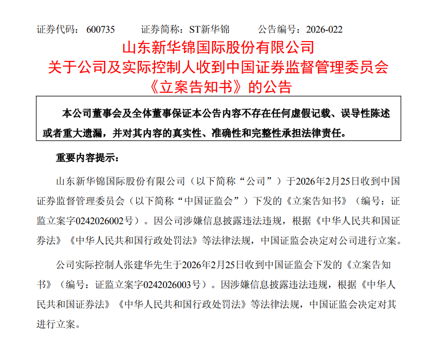 【大河财立方消息】2月25日,山东新华锦国际股份有限公司公告,收到中国证监会下发的《立案告知书》,因公司涉嫌信息披露违法违规,中国证监会决定对公司及实控人张建华进行立案。