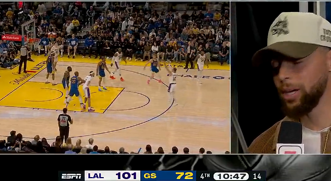 第四节比赛中,肯纳德被放空投进第3记三分,湖人领先勇士至最大分差32分。